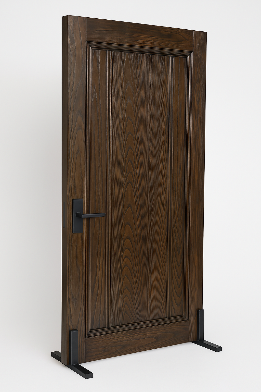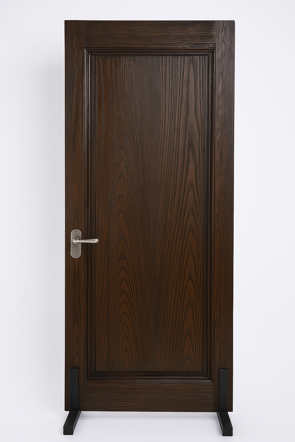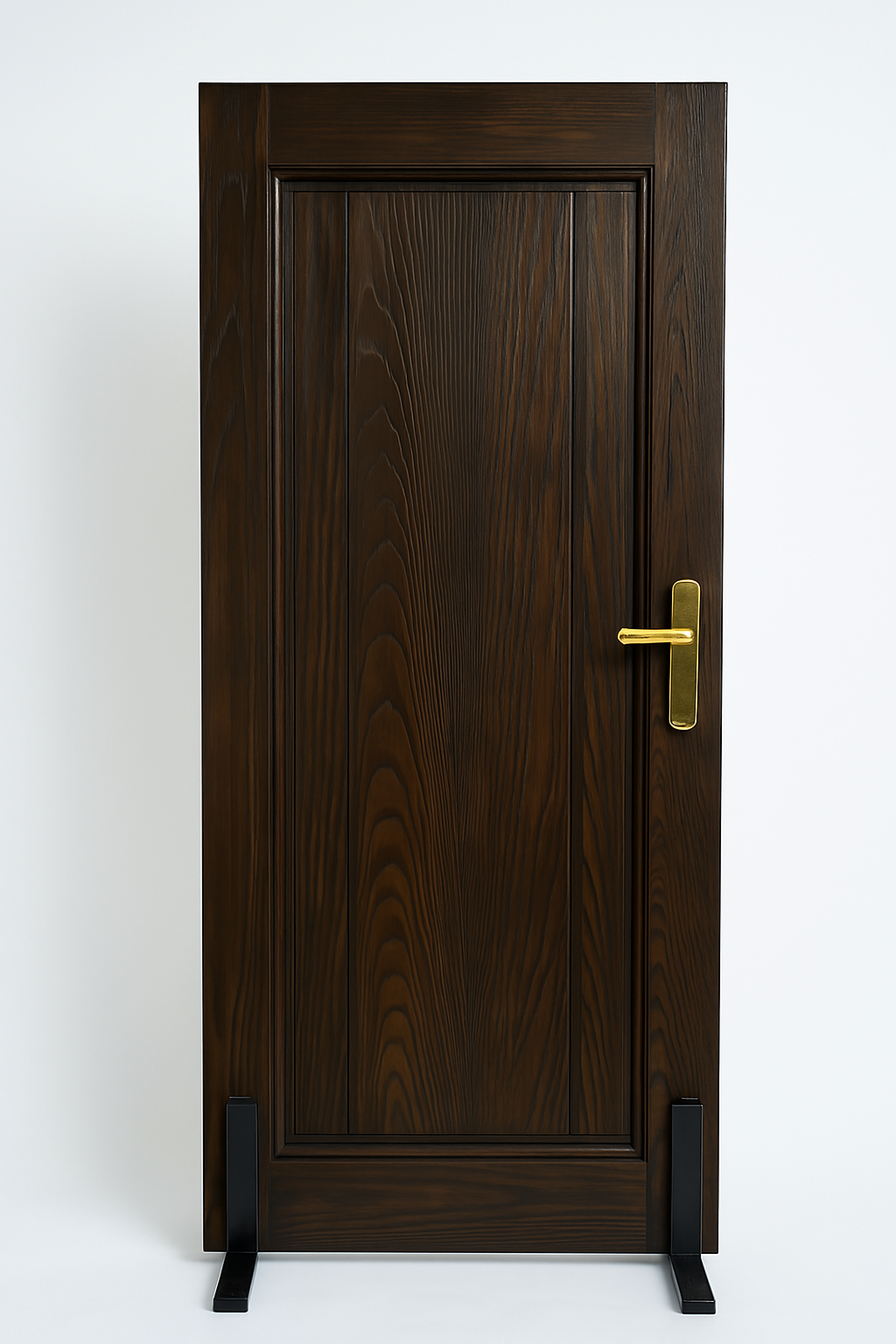 這是一扇充滿沉穩氣質的深胡桃木色實木門,整體設計散發出高雅、古典而不失現代質感的氛圍,適合安裝於講究風格與品味的空間中。